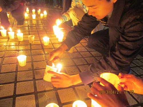 紧接着,晚上7点半,南华广场,烛火被排列成“心”型以及“雅安加油,4.20”的字样,《爱的奉献》的旋律一遍遍地响起,越来越多的人加入到这场爱的活动中来,这一刻,我们都是雅安人。守望生命,选择坚强。温暖的烛光前,大家一齐默哀,为雅安祈福。“雅安!加油!加油!雅安!”这不仅仅是一声简单的呐喊,更是在场所有人心底深处的渴望。默哀结束后,伴随着手语《爱的奉献》。募捐箱前,无论是老师、学生,还是路过的小朋友,大家都停下脚步,为雅安献出了自己的绵薄之力。爱心继续传递着,小小的举动,大大的爱。