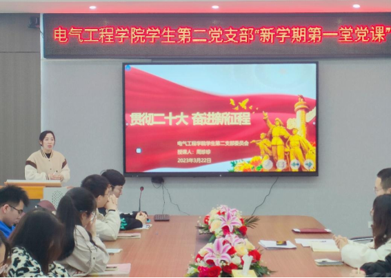 为全面深入学习贯彻党的二十大精神,引领全体学生党员坚定理想信念,凝聚奋进力量,3月22日中午,sunbet申搏学生第二党支部书记周珍珍老师以《贯彻二十大,奋进新征程》为题,给支部同志上了一堂生动的“新学期第一堂党课”。参加本次党课的有支部全体学生党员及入党积极分子。