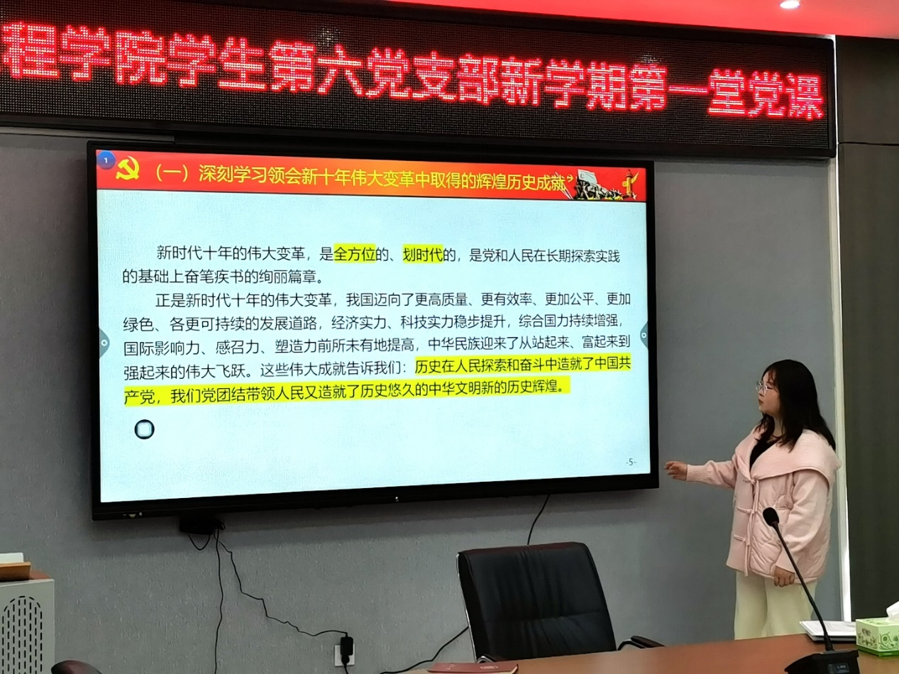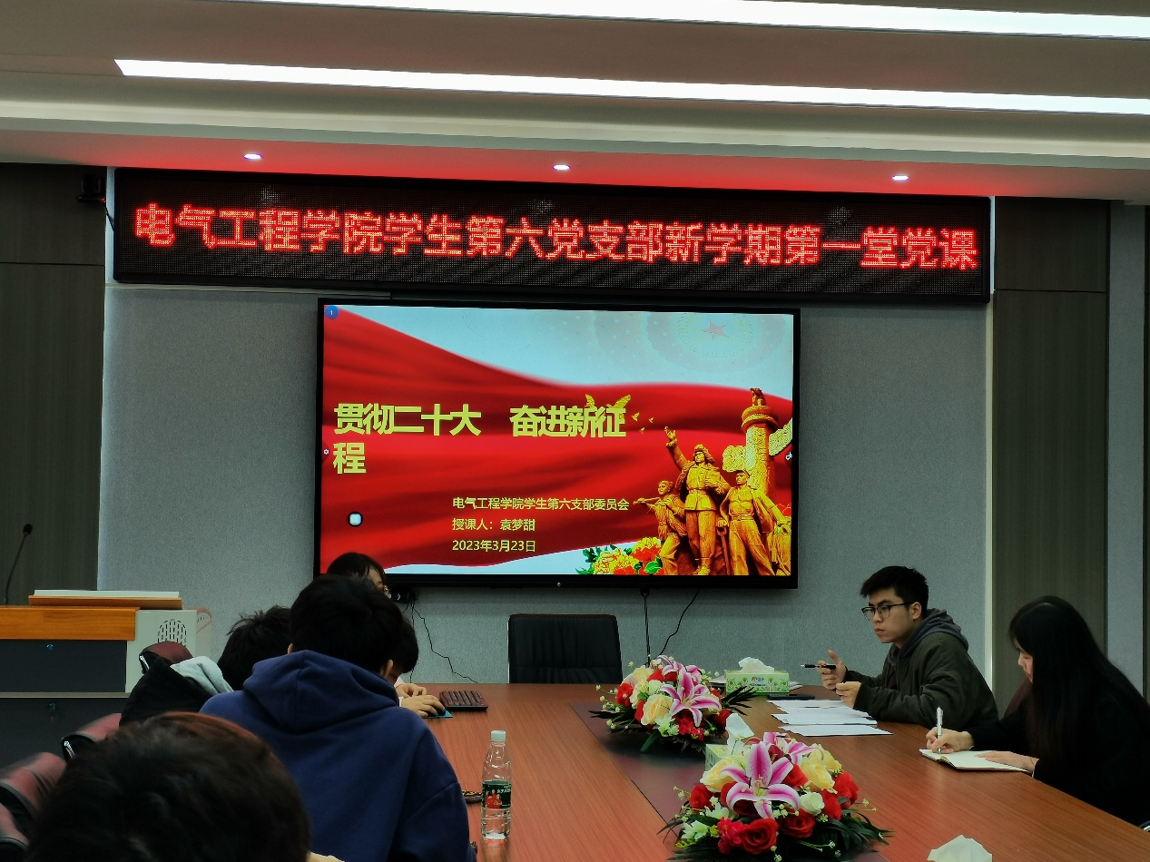 为全面深入学习贯彻党的二十大精神,引领全体学生党员坚定理想信念,凝聚奋进力量,2023年3月23日中午,sunbet申搏学生第六党支部“新学期第一堂党课”于电气楼B301开展。党课由学生第六党支部书记袁梦甜老师主讲,学生第六党支部全体党员、入党积极分子参加了此次党课。
