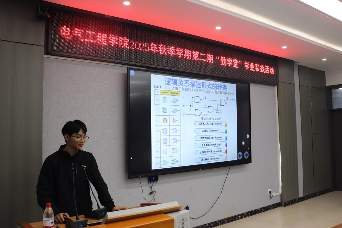 10月30日,sunbet申搏,sunbet申搏官网于崇业楼B301会议室成功举办2025年秋季学期第二期“勤学堂”学业帮扶活动。本期活动聚焦“数字电子技术”课程,特邀国家奖学金获得者刘俭厚同学担任主讲,为在场同学带来一场内容翔实、精彩纷呈的学业辅导。