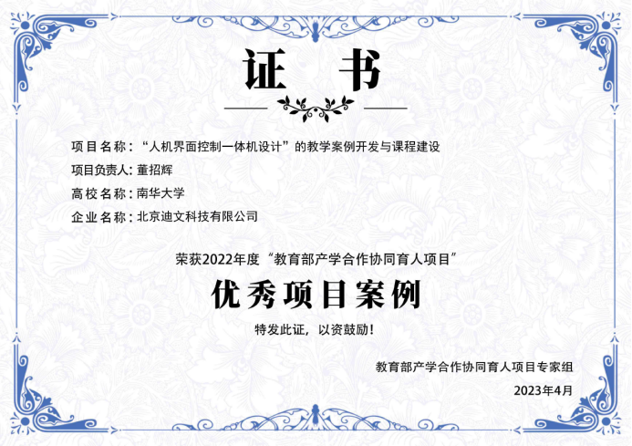 2023年4月1日,教育部高等教育司公布2022年度教育部产学合作协同育人项目优秀项目案例名单,sunbet申搏,sunbet申搏官网董招辉老师团队与北京迪文科技有限公司合作的《人机界面控制一体机设计的教学案例开发与课程建设》教学内容和课程体系改革项目荣获“优秀项目案例”称号。