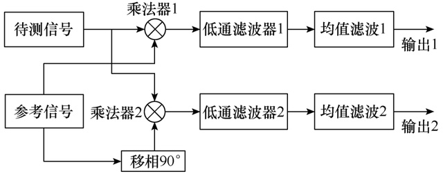 将双频信号分别作为参考信号,其双相锁相电路原理如图5所示。参考信号和参考信号移相90°后的信号分别与待测信号相乘,然后再分别通过低通滤波器1和低通滤波器2,并作均值滤波后输出。