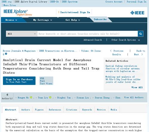 论文标题:“Analytical Drain Current Model for Amorphous InGaZnO Thin-Film Transistors at Different Temperatures Considering Both Deep and Tail Trap States”。论文链接:https://doi.org/10.1109/TED.2017.2721436