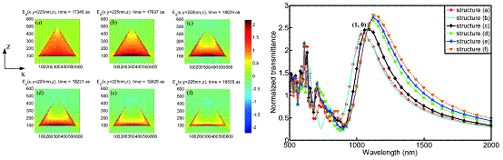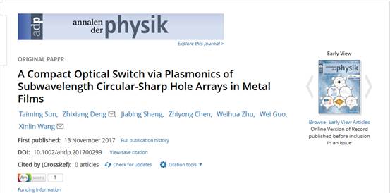 在前述研究基础上,我院光电子与激光技术团队鉴于当前的表面等离激元光开关存在结构复杂,尺寸较大,难以集成,需要外界泵浦光控制,并且不可避免的存在泵浦光对信号光及后续光路的干扰等,设计一种特殊结构,实现了有效的紧凑型微纳光开关;通过改变入射光的偏振方向可实现“开”和“关”操作,其具有结构简单、方便操作及无泵浦光干涉等优点。这一研究成果:“A Compact Optical Switchvia Plasmonics of Subwavelength Circular-Sharp Hole Arrays in Metal Films”于2017年11月13日在德国著名物理期刊《Annalen der physik》上发表,物理电子学专业硕士研究生孙太明为第一作者,邓志象博士、王新林教授为共同通信作者。该项研究成果提出的光开关设计为表面等离子体光子器件的设计提供了新思路,拓展了金属微纳结构在通信及信息处理领域的应用范围。