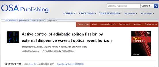 光纤传输是以光导纤维为介质进行的数据、信号传输。光传输系统由三个部分组成,即光源、传输介质和检测器。然而,超连续谱光源是一种脉冲激光光源,具有相对于可调谐激光器更宽的光谱范围,广泛应用于荧光成像、宽频光谱学、光学同调断层扫描术等领域。高阶孤子分裂是超连续谱产生过程的主要机制之一,当前高阶孤子分裂主要是通过传输介质的特性来控制,具有可控性差等特点。我院光电子与激光技术团队与英国阿斯顿大学刘军博士及湖南大学赵楚军教授等合作研究,基于光学视界理论,提出并实现通过外部输入弱线性波主动调控高阶孤子绝热分裂过程;其通过改变外部输入弱线性波的峰值功率和相对中心频率位置方式等,实现了高阶孤子分裂的主动控制过程。该项研究成果:“Active control of adiabatic soliton fission by external dispersive wave at optical event horizon”于2017年11月3日在美国光学学会旗下权威期刊《Optics Express》上发表,南华大学为第一单位,邓志象博士为第一作者,刘军博士与王新林教授为共同通信作者。该项研究成果将可能应用于改进超连续谱光源以及操控光学流氓波形成等方面,也为未来超快逻辑线路实现开辟了新的思路。