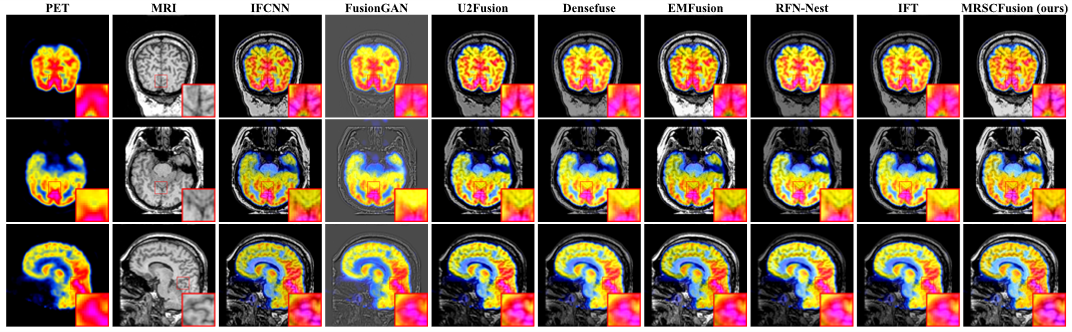 此外,为进一步有效地保留医学影像的纹理特征和强度信息,定义了包含内容损失和强度损失的联合损失函数来约束融合模块,并引入自适应权重来控制源图像的信息保留程度。所提出的框架在CT-MRI、PET-MRI和SPECT-MRI等多个融合任务上进行实验,通过定性和定量分析验证了模型的优越性。