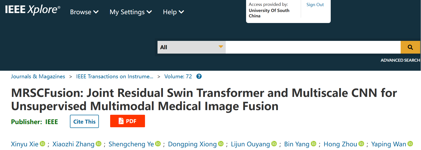 近期,南华大学电气工程学院张小志课题组及合作者提出了一种联合Swin Transformer和多尺度卷积神经网络的无监督深度神经网络,用于多模态医学影像的融合。相关研究成果以“MRSCFusion: Joint Residual Swin Transformer and Multiscale CNN for Unsupervised Multimodal Medical Image Fusion”为题,在国际权威期刊《IEEE Transactions on Instrumentation and Measurement》上发表。