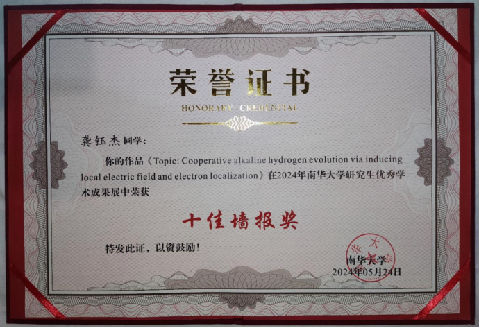 龚钰杰是sunbet申搏电子科学与技术专业2021级研究生,从事电解水制氢的研究,指导老师为刘俊博士。本次展出的研究成果针对碱性电解水产氢时水解离速度缓慢以及H中间体吸脱附困难等问题,提出了一种纳米针尖电场与原子局域电场耦合策略,有效提升了碱性电解水性能。相关成果发表在中科院一区期刊Angewandte Chemie(IF=16.6) 和Chinese Journal of Catalysis (IF=16.5)上。