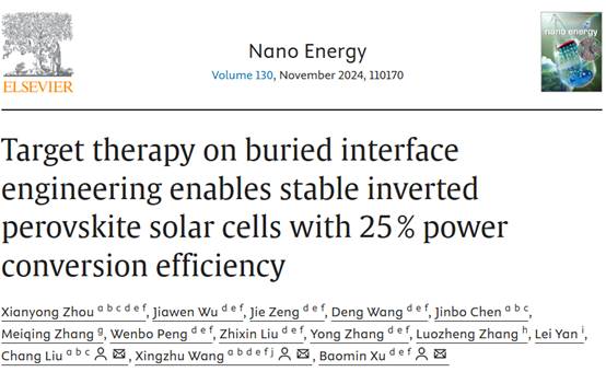 近日,sunbet申搏,sunbet申搏官网王行柱、刘畅团队在国际顶尖学术期刊Nano Energy(中科院1区Top期刊,IF=16.8)上发表了题为“Target therapy on buried interface engineering enables stable inverted perovskite solar cells with 25 % power conversion efficiency”的研究论文。