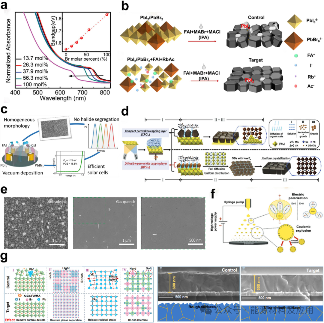 图12、a) 不同MABr比例下的吸收光谱与带隙线性关系;b) FAI/RbAc调控PbI₂/PbBr₂结晶行为;c) 四源真空沉积系统与薄膜表征;d) DPCL与CPCL结晶动力学对比;e) 气淬法与反溶剂法薄膜形貌对比;f) 电喷雾沉积机制图;g) 纳米抛光前后薄膜截面SEM图。