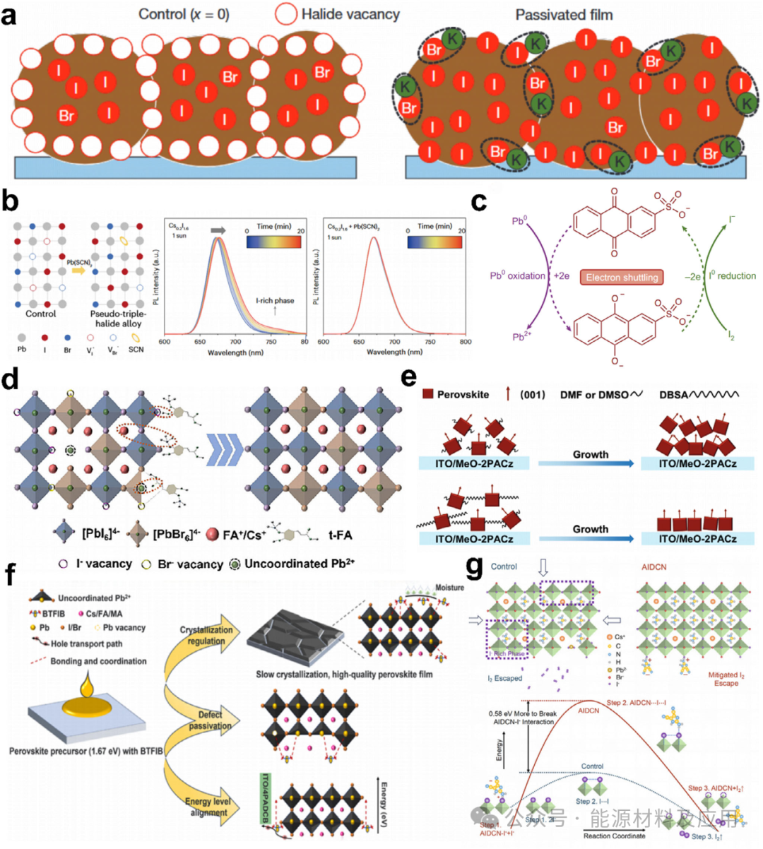 图8、a) K⁺调控卤素空位机制图;b) SCN⁻合金化抑制相分离机制;c) 蒽醌磺酸根电子穿梭机制;d) t-FA与钙钛晶格相互作用图;e) DBSA诱导(001)晶面择优取向机制;f) BTFIB调控结晶机制;g) AIDCN抑制碘逃逸与相分离机制图。