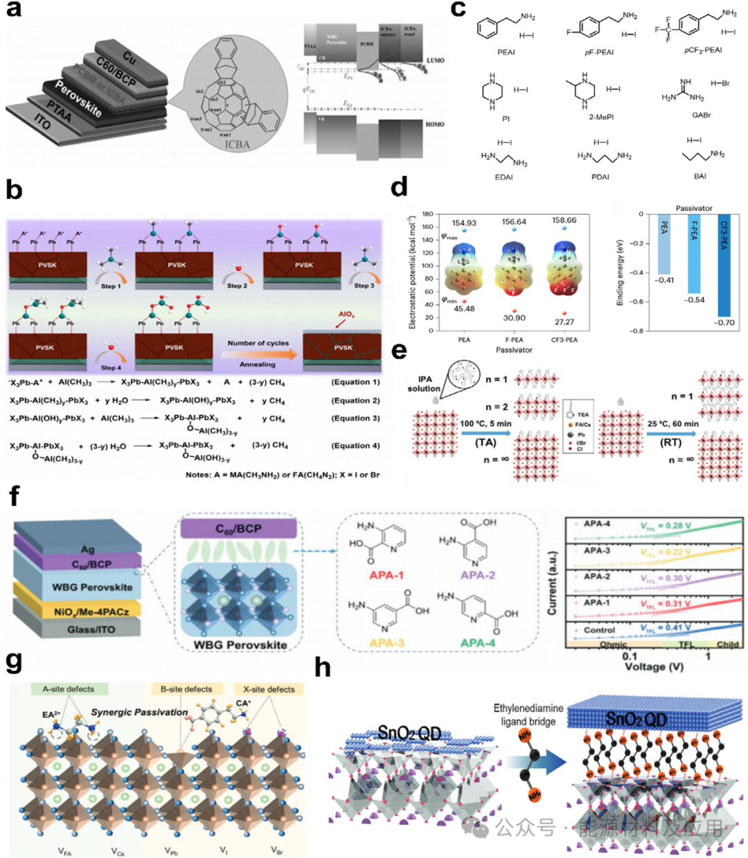 图7、a) ICBA与C60能级对比及Voc提升机制;b) ALD-AlOx在钙钛矿表面生长机制;c) 2D钙钛矿钝化结构示意图;d) PEA、F-PEA、CF₃-PEA静电势与缺陷结合能图;e) TEACl钝化钙钛矿薄膜的热处理对比图;f) 吡啶衍生物异构体结构及其缺陷钝化效果;g) CF₃-PEA⁺与EDA²⁺协同钝化机制;h) EDA桥联钙钛矿与SnO₂界面策略图。