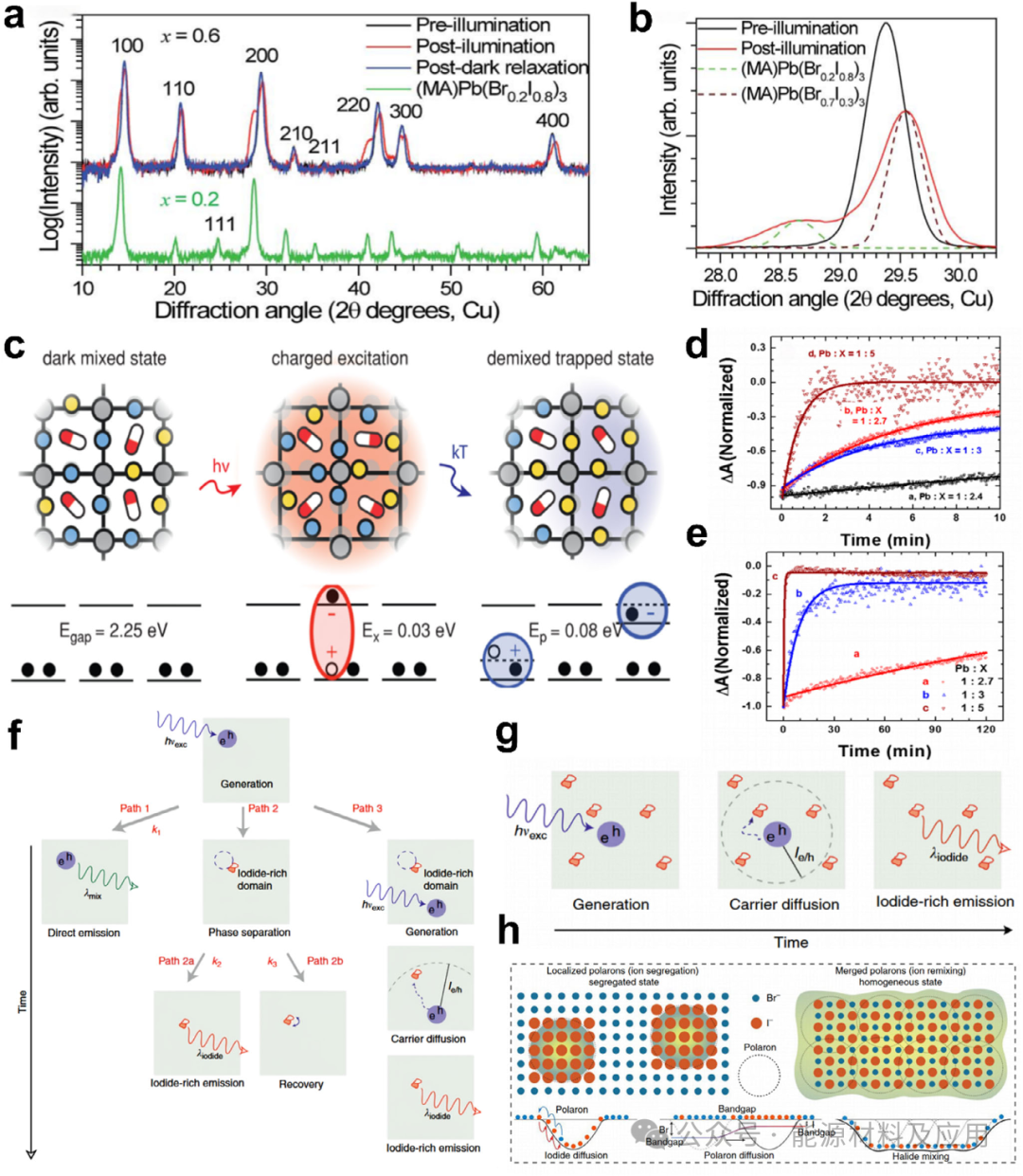 图2、a) MAPb(Br₀.₆I₀.₄)薄膜在光照前后的XRD图谱变化;b) (200)晶面XRD峰的光照响应;c) 极化子诱导相分离的能量示意图;d-e) 不同卤素比例下的相分离动力学与恢复过程;f-g) 低/高激发强度下的相分离路径示意图;h) 高/低光子通量下的卤素离子分布模型。