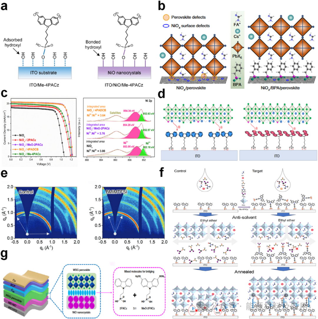 图6、a) Me-4PACz与NiOx结合示意图;b) BPA钝化NiOx表面缺陷机制;c) 不同SAM修饰下的J-V曲线与XPS谱图;d) 4PACz与4PADCB分子结构及其界面作用示意图;e) BMIMTFSI调控钙钛矿结晶的GIWAXS图;f) 2PACz与Me-4PACz顺序沉积策略示意图;g) 2PACz与MeO-2PACz混合SAM策略图。
