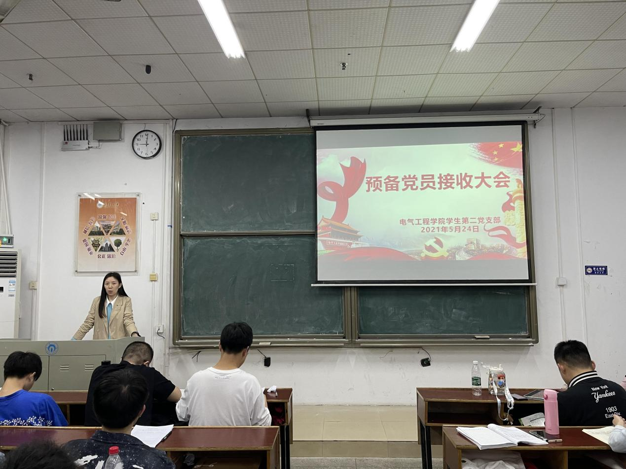 2021年5月24、25日晚19:00,电气工程学院学生第二党支部在南华楼109召开党员大会。参与会议的有支部全体党员、发展对象。会议由组织委员黄晓鹏主持,议题为讨论范灿文、肖庭婷等50名发展对象的接收问题。