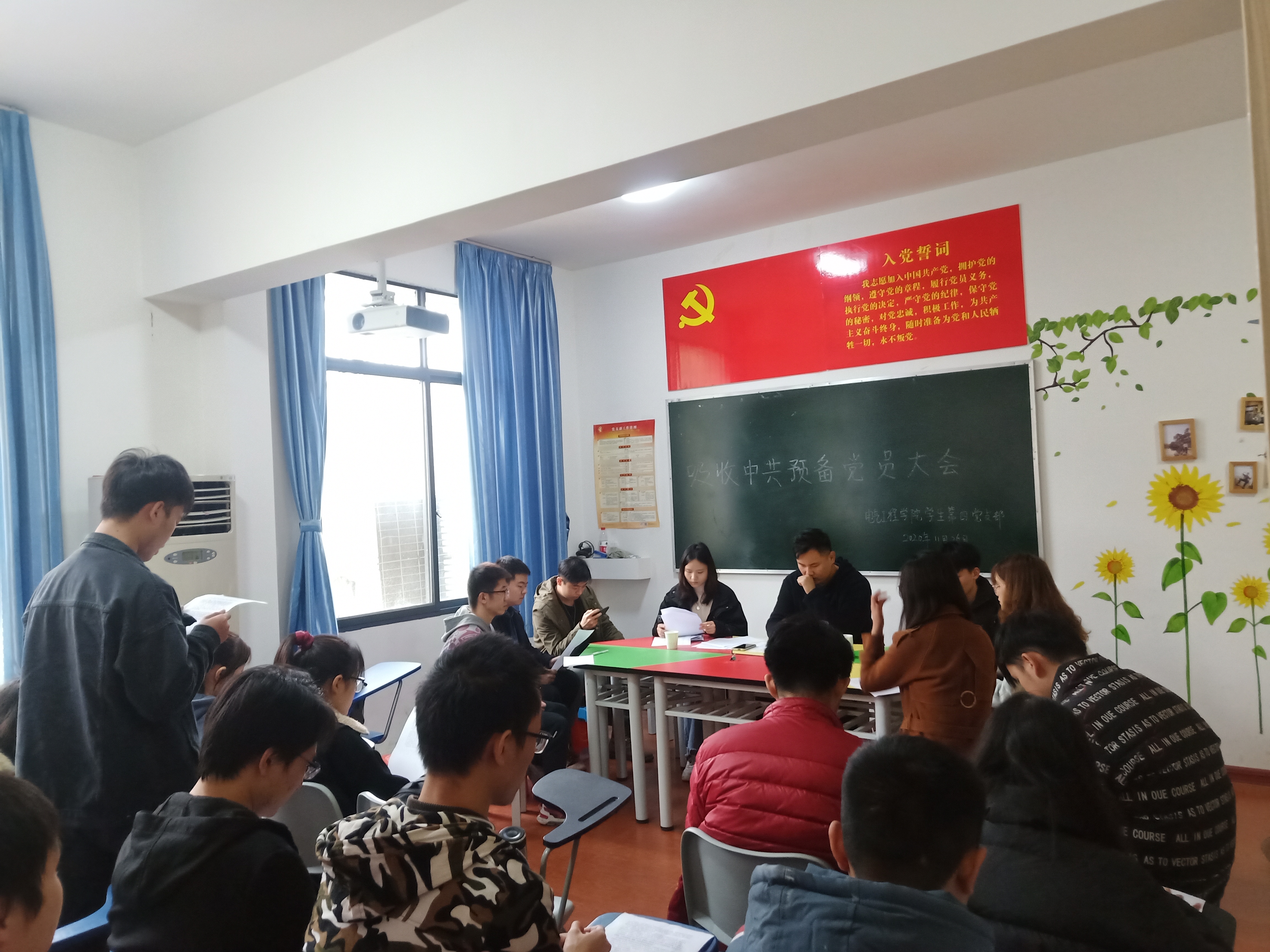 2020年11月26日中午,sunbet申搏学生第四党支部在电气楼成长辅导室召开了支部大会。参与会议的有支部所有党员、要吸收的发展对象,应到正式党员6名、预备党员15名,实到正式党员6名、预备党员15名。本次会议主要内容为吸收预备党员。此次会议由党支部副书记龙杨帆同志主持。